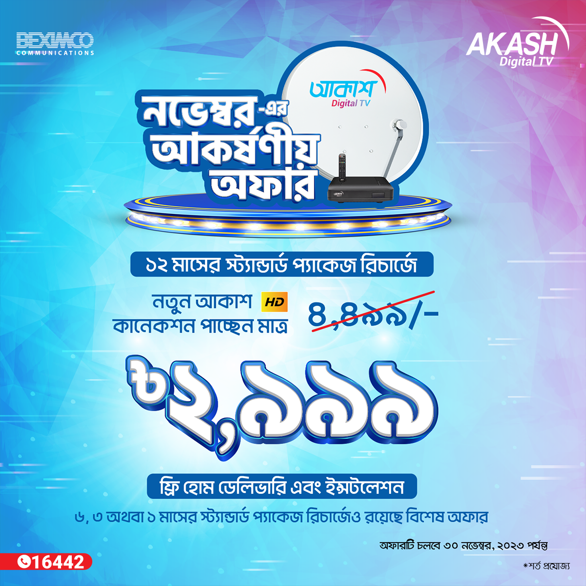 অফারটি চলবে আগামী ৩০ নভেম্বর, ২০২৩ পর্যন্ত। সহজে অফারটি পেতে আপনার নিকটস্থ আকাশ রিটেইল পয়েন্টে যোগাযোগ করুন অথবা ভিজিট করুন www.akashdth.com বা কল করুন ১৬৪৪২ নম্বরে।