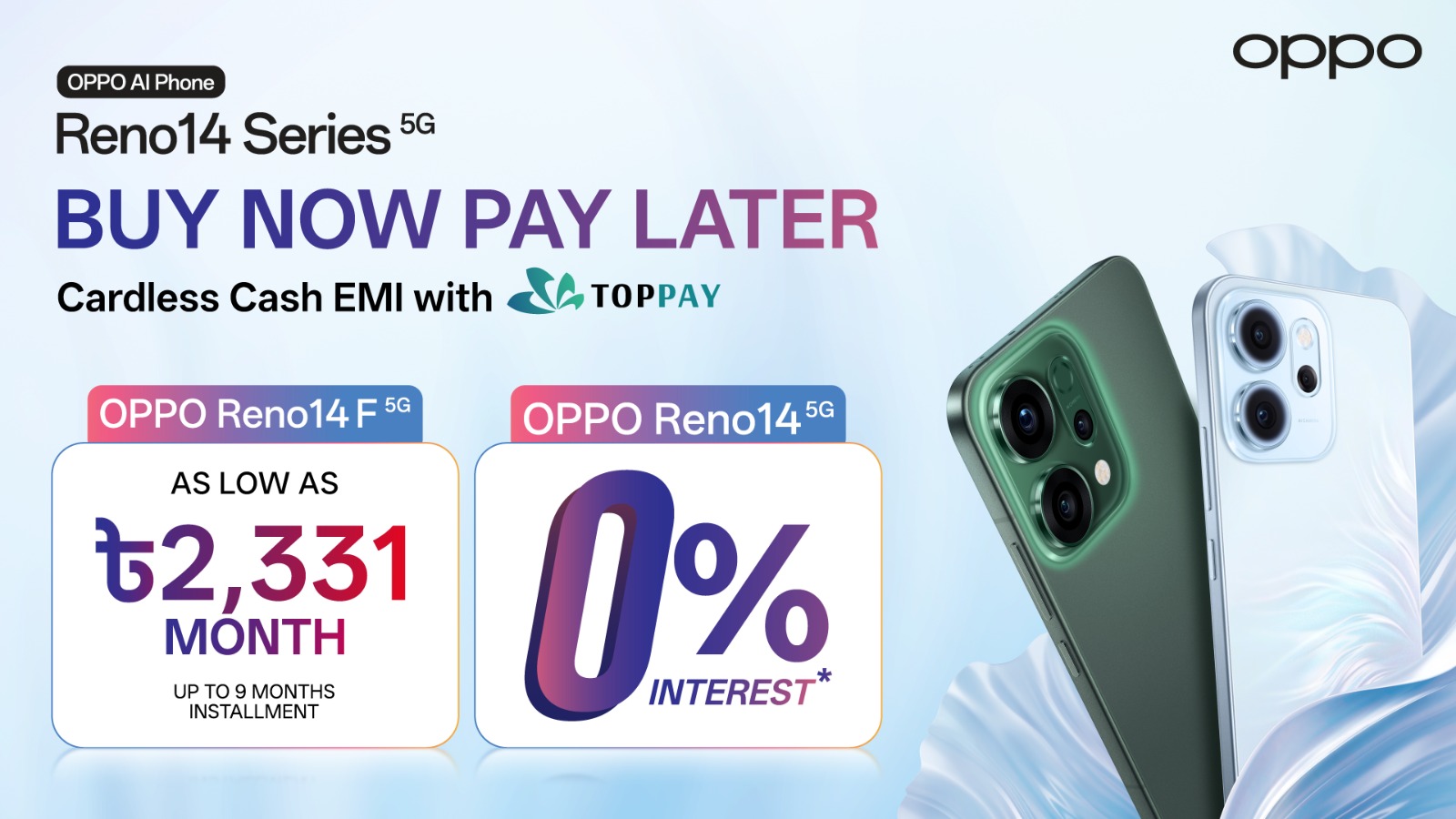 টপপে’র মাধ্যমে ০% ইন্টারেস্ট রেটে কার্ডলেস ক্যাশ ইএমআই সুবিধার কারণে এখন ক্রেতারা রেনো১৪ সিরিজ ফাইভজি ডিভাইসটি কেনার ক্ষেত্রে আর্থিক সাশ্রয় ও স্বাচ্ছন্দ্য পাবেন; এই সুবিধা পেতে কোনো ক্রেডিট কার্ড দরকার হবে না। ইনস্ট্যান্ট ডিজিটাল অ্যাপ্রুভাল ও ফ্লেক্সিবল মাসিক কিস্তির কারণে এখন আর্থিক জটিলতা থেকে মুক্ত থেকেও অপোর ফ্ল্যাগশিপ-লেভেলের উদ্ভাবন আরও বেশি ব্যবহার করার সুযোগ পাবেন। এখন স্মার্ট ইএমআই সমাধানের মাধ্যমে কোনো ধরনের ঝামেলা ছাড়াই রেনো১৪ ফাইভজি ও রেনো১৪ এফ ফাইভজির মতো সর্বাধুনিক স্মার্টফোন ব্যবহার করার সুযোগ পাবেন সবাই।