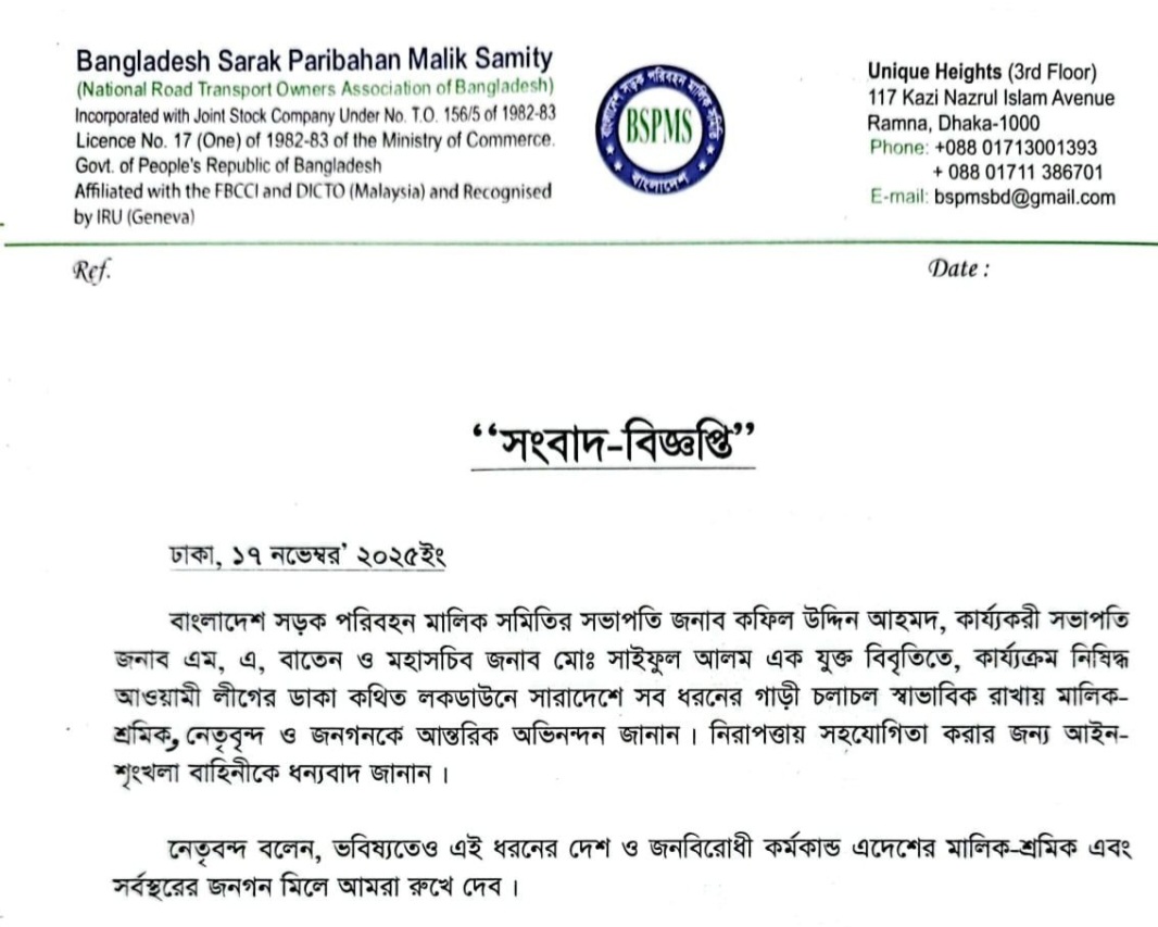 সংবাদ-বিজ্ঞপ্তিটি প্রেরণ করেন বাংলাদেশ সড়ক পরিবহন মালিক সমিতির সাধারণ সম্পাদক (সদর) এ.এস.এম. আহম্মদ হোসেন।